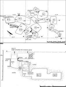 The Persian complex contains a grand podium with two preserved towers nos 1 and 10, eight defensive towers nos 2-9, a ramp, a retaining wall and a restored temple topped the podium. This enormous complex as a whole was dated between the second third of the seventh century BCE and the second third of the fourth century BCE. The monumental podium and the temple were erected at the same time approximately by the end of the six century BCE. The defensive offset-inset wall was established in the late fifth or early fourth centuries BCE. The great podium measured 70×40m and 16m high. In front of the podium eastward there is an offset-inset defensive barrier contained eight towers nos 2-9. Between the podium and Tower 9 is a long and wide ramp alongside the podium, this passage was paved and the entrance was blocked off by a wide leaf door. A few meters northwest of the podium was a staircase of large steps made up of large limestone slabs. To the west side of the podium was opened an entrance the same width of the entrance of the restored temple. Seven meters in front of the staircase to the east was built Tower 10. It is probable that this tower intended to monitor the northern side and the entrance to the city. The restored temple is a large rectangular building measured 42×21m. The main hall in the temple measured 15m and contains two rows of square shafts each contained five pillars. The temple opens to the west with a 7m wide entrance in a sort of two-chambered gate. In the eastern end of the temple is a large projecting chamber measured 5m. To approach the temple the worshippers had to enter first to the proposed two-chambered gate then to the main hall.