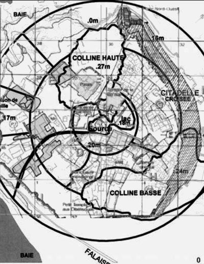 It was proposed that the town of Byblos is divided into seven quarters by main streets at a short distance from the Baalat Temple between the temple of Baalat and the the temple in "L". A general pattern for which a round shape was proposed not only in the general pattern but also in the organization of the settlement texture with concentric streets leading towards the centre of the site.of their length. Neighborhoods are organized regularly juxtaposed around central courtyards shared by different houses.